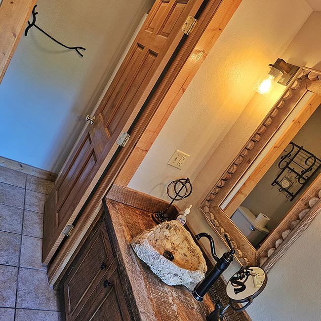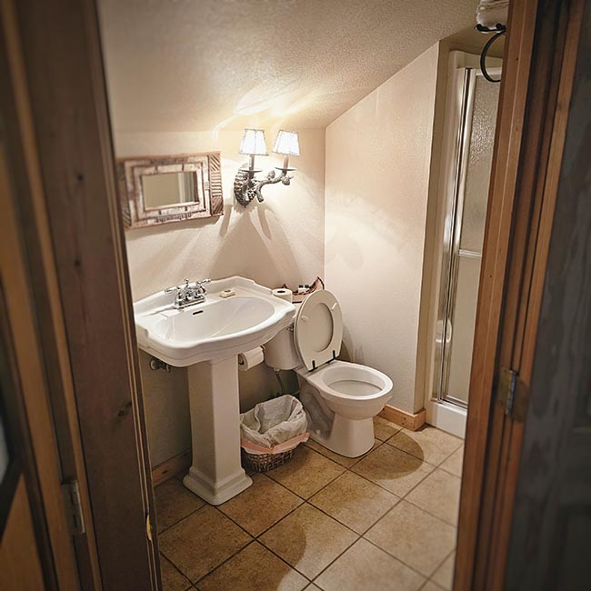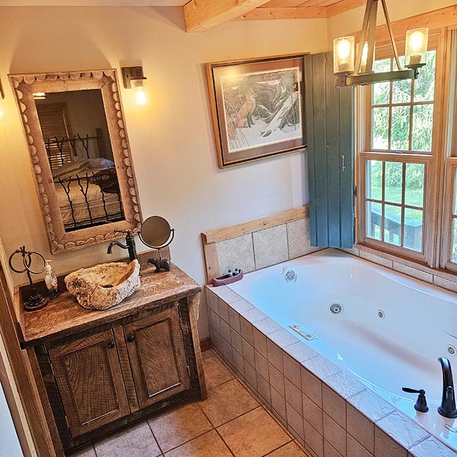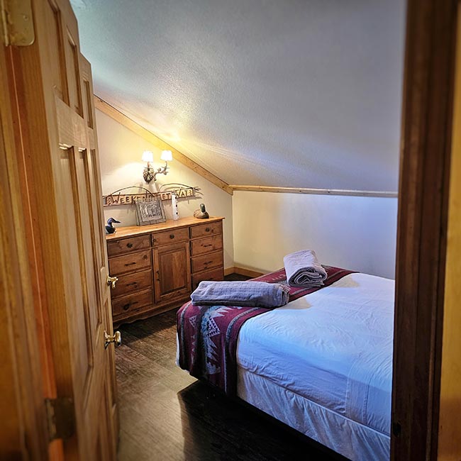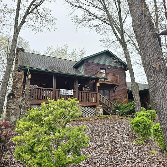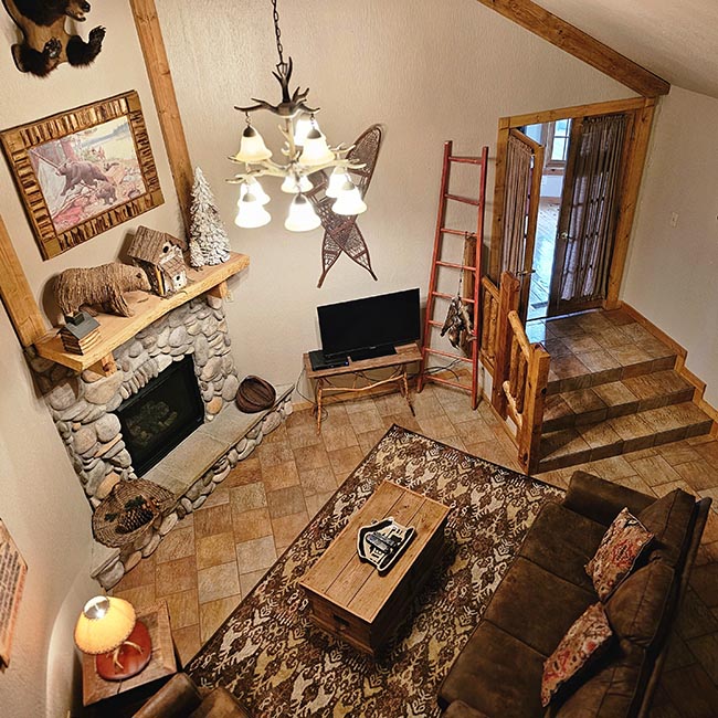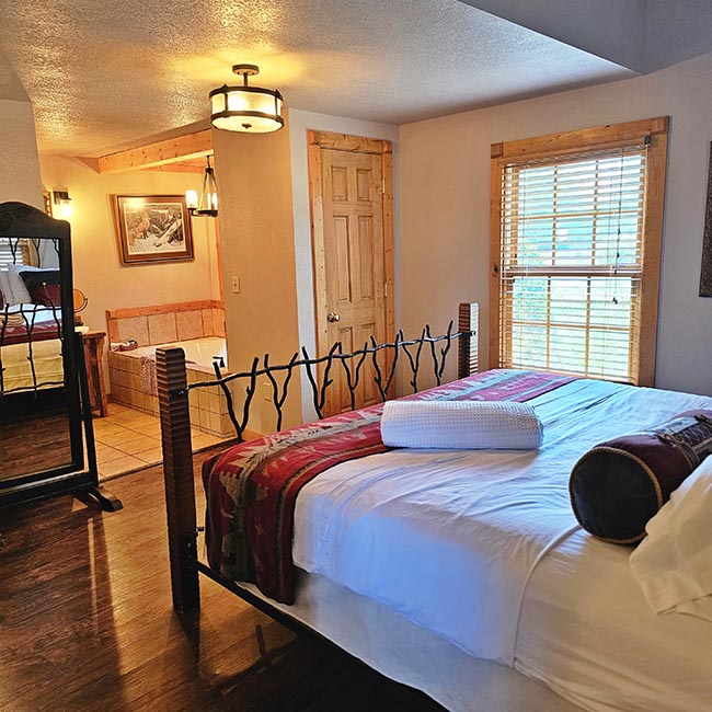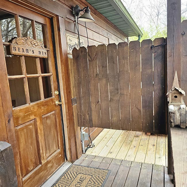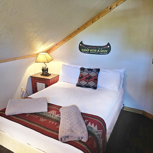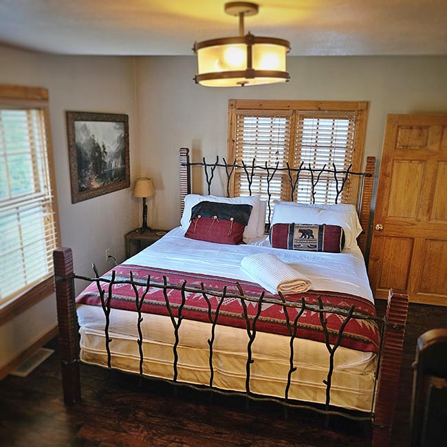 The Bear’s Den is our largest and most luxurious suite inside the main lodge. It is the entire North wing of the Bed and Breakfast. Unlike most B and B’s our Bear’s Den has it’s own private front porch and entrance. With it’s cathedral ceilings, river stone fireplace, and a loft with overlooking balcony, the Bear’s Den has a great Lodge atmosphere. The Bear’s Den can sleep 2 to six guests comfortably. It’s master suite has a king size rustic iron bed and it’s master bath has a full shower and tub. The upstairs loft has a full bath and bedroom with a queen size bed. The Bear’s Den has a half kitchen with a full size refrigerator, microwave, sink, with cook stove with oven. There is a living room with fireplace and additional half bath. The living room has a queen size hideaway sofa. The extra space and extra comfort of the Bear’s Den makes it a great choice for families of multiple couples. Roll out sofas in units are not comfortable for adults and are intended for children only. Bear Creek Cabin Resort