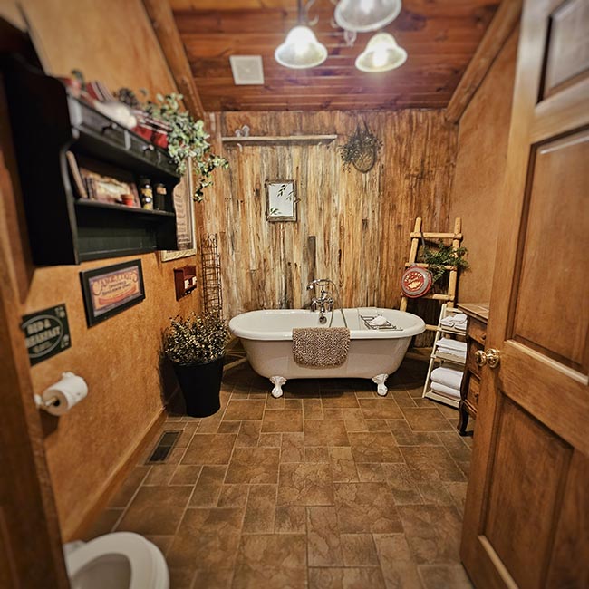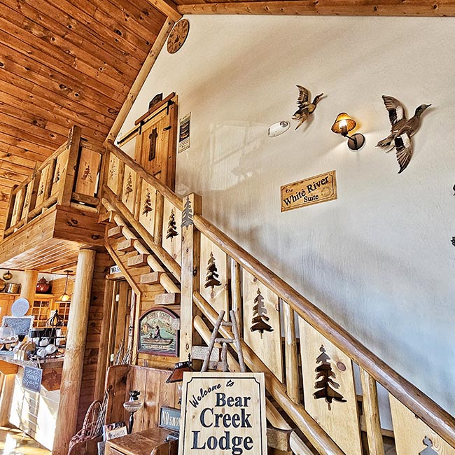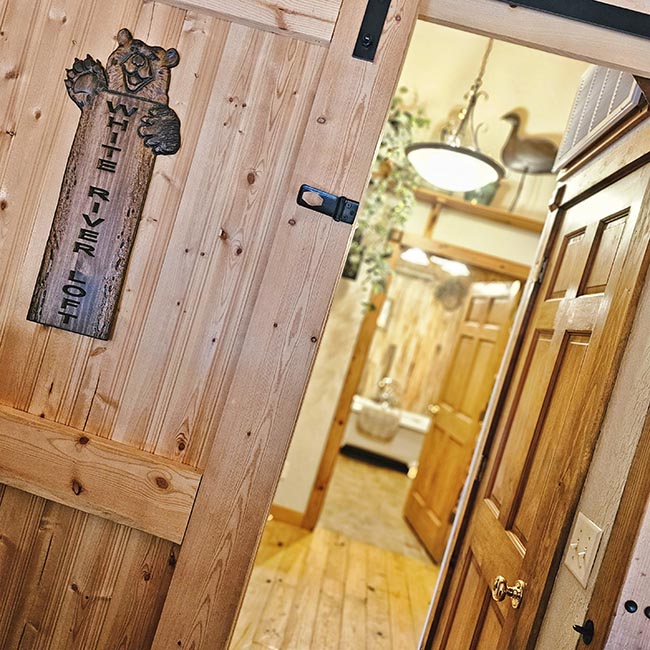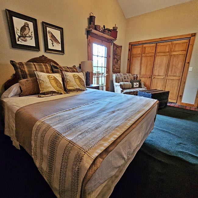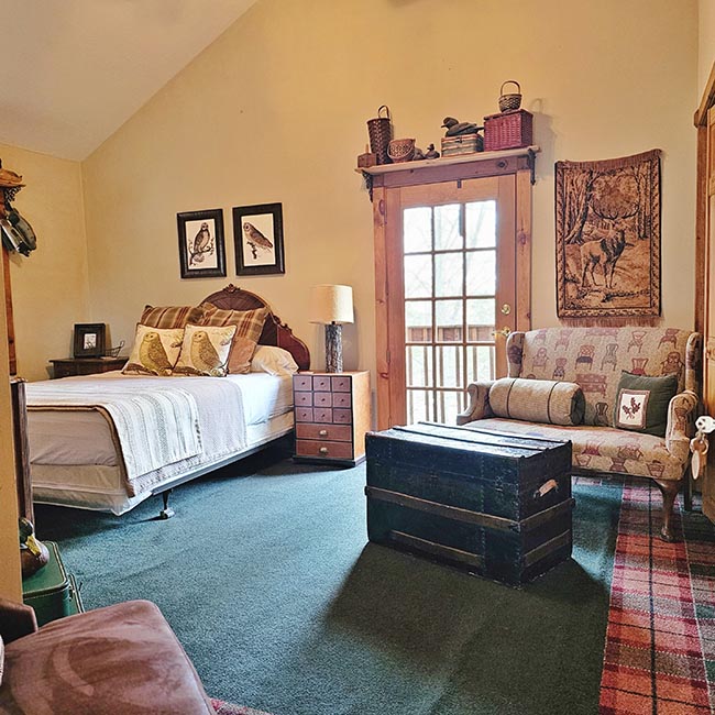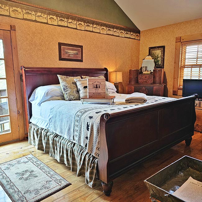 The White River Suite is our second largest suite. The White River Suite is the whole top floor of the Bed and Breakfast. The bedroom has an elegant lodge feel; it’s antique mahogany bedroom suite, soaring ceilings, and two private balconies make this a great spot to relax, and unwind. The master bedroom has a queen size bed with a sitting area, mini-fridge and microwave. There is a small balcony overlooking the woods and walking trail. The bathroom has a reproduction antique clawfoot soaker tub with a shower head and a charming sink vanity made from an antique dresser. This unit cannot be rented to guests with children under the age of 10 years old, due to the steep staircase.
